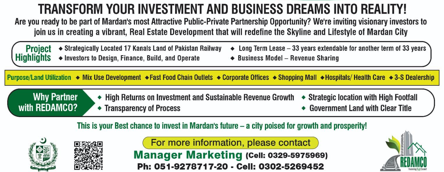 REDAMCO, serves as vital arm of Ministry of Railways for initiatives such as, Public-Private Partnerships, Licensing & Leasing, and Branding on the properties of Pakistan Railways. We pledge Transparent, Competitive, and Qualitative Transaction Processes by openly inviting investors/ developers to partner in realizing this tremendous Business Potential